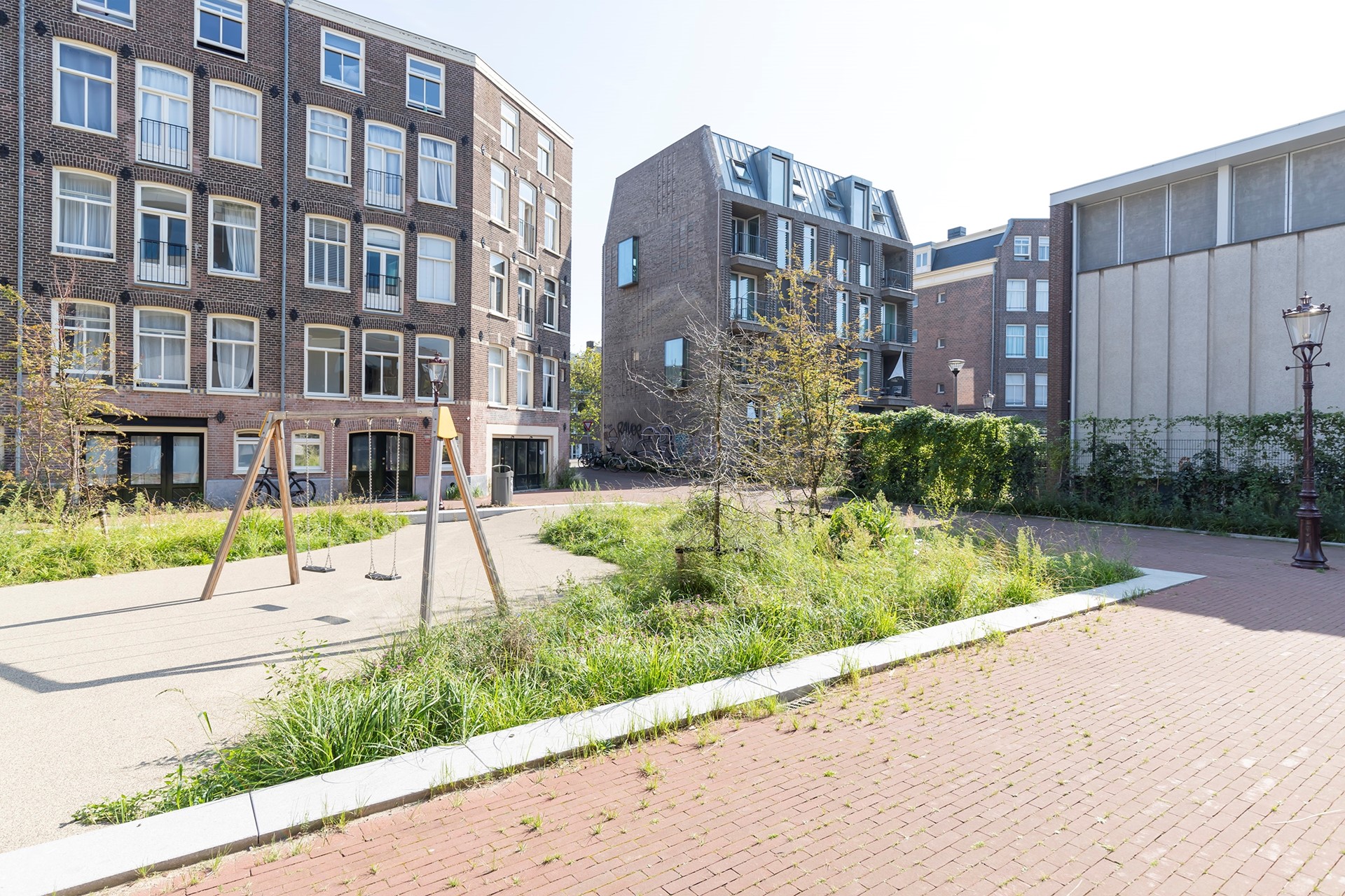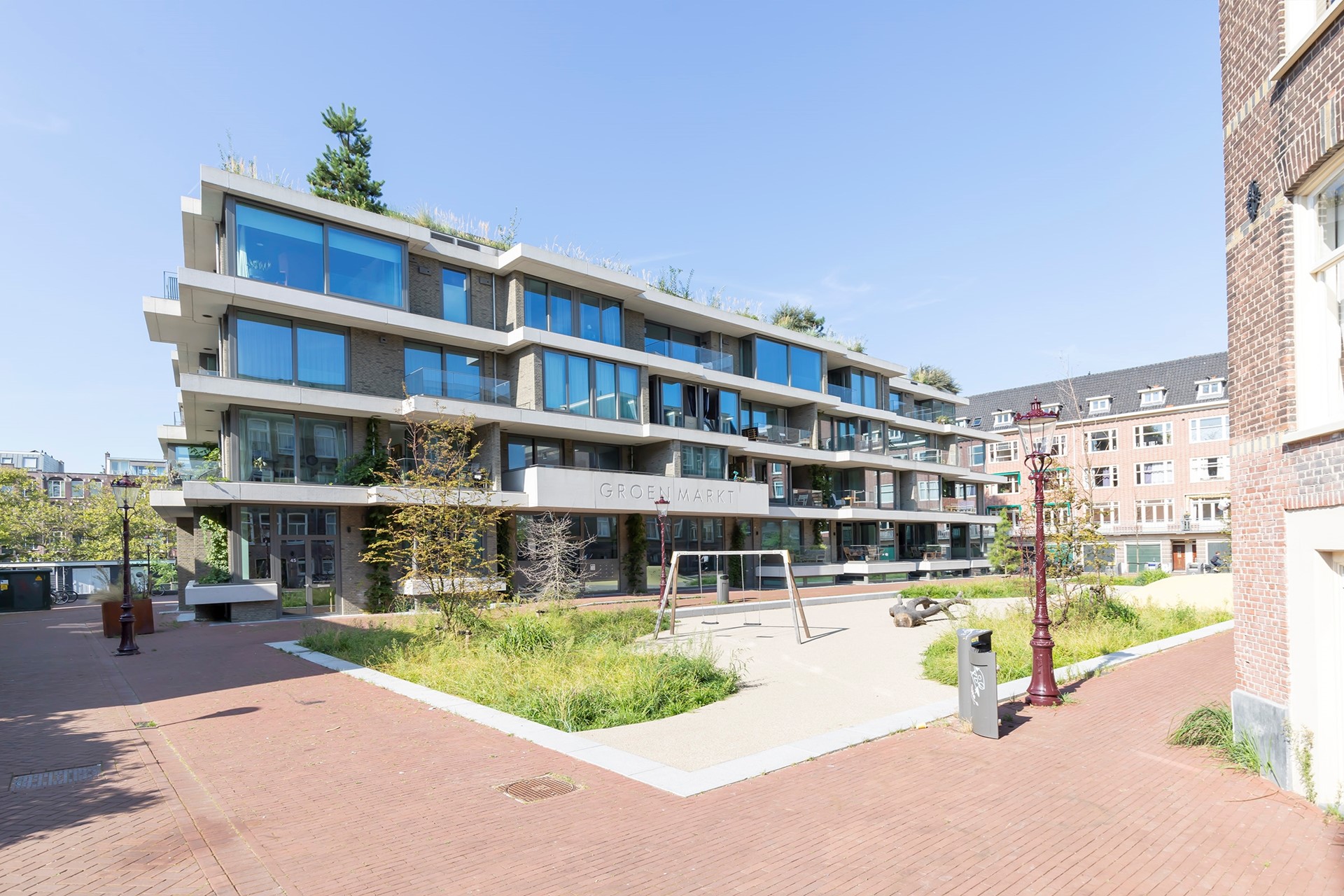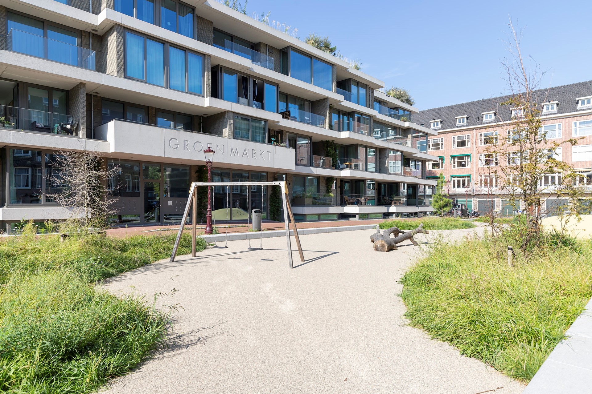 Groenmarkt. De naam zegt het al. Op deze mooie plek aan de Singelgracht kwamen vroeger – per boot – de groenten vanuit de polders de stad in gevaren. Spruiten, spitskool, witlof en prei! Alles 100% biologisch natuurlijk, want iets anders bestond nog helemaal niet. Supergezond. Architecten Bastiaan Jongerius en Ronald Janssen ontwierpen voor deze historische plek, samen met landschapsarchitect Harro de Jong, een nieuw Jordanees plein. Aan de Singelgracht een elegant, modern appartementengebouw met 35 appartementen inclusief 22 parkeerplaatsen in de ondergrondse garage en alle ruimte voor Moeder Natuur. Mooie terrassen met ‘doorgroeibare’ vloeren en plafonds, bijenhotels en zwaluwkastjes en dan op het dak – een spectaculair daklandschap met natuurzwembad, ‘strandhuis’ en gym voor alle bewoners.