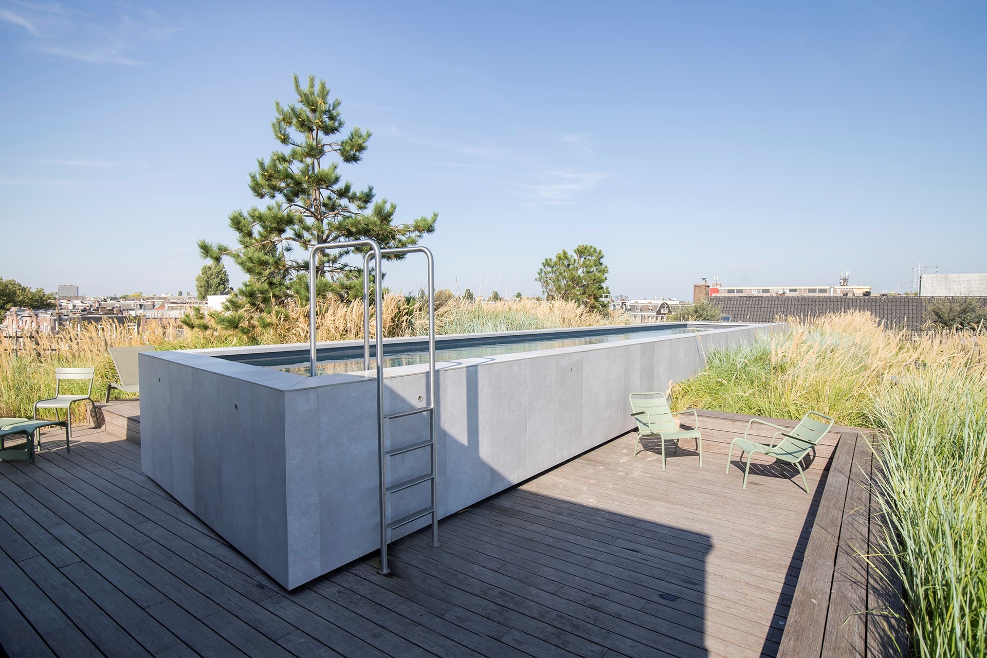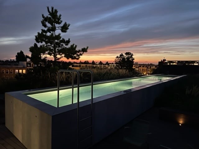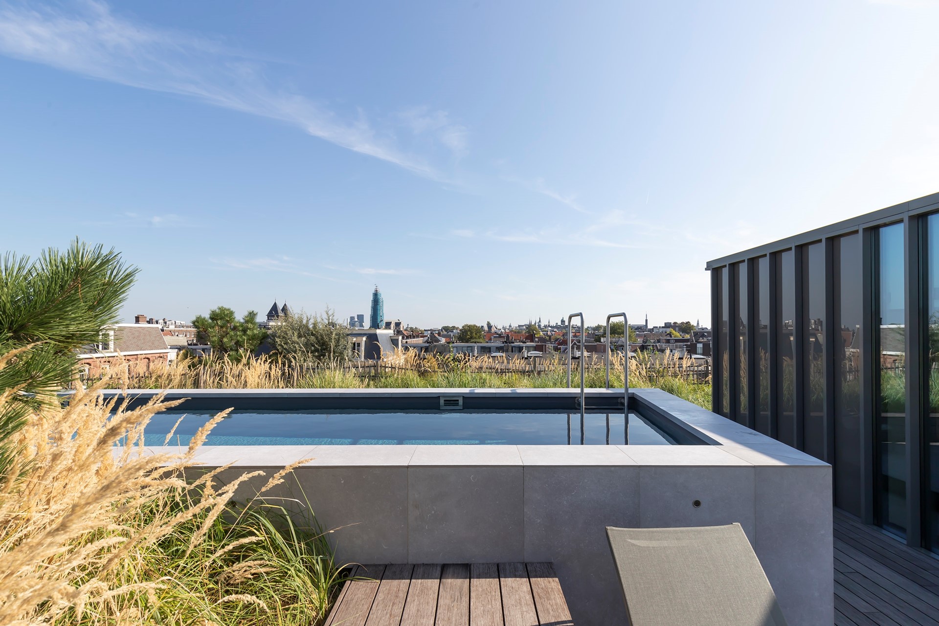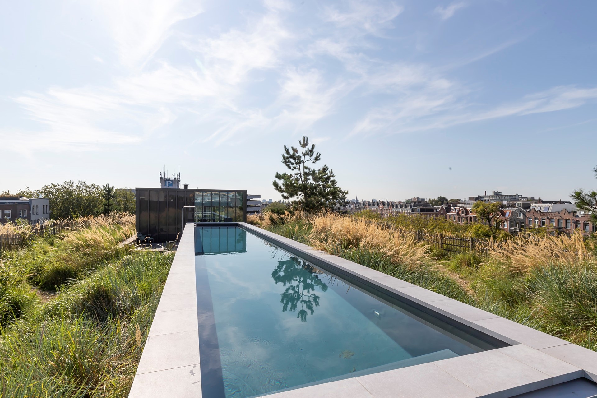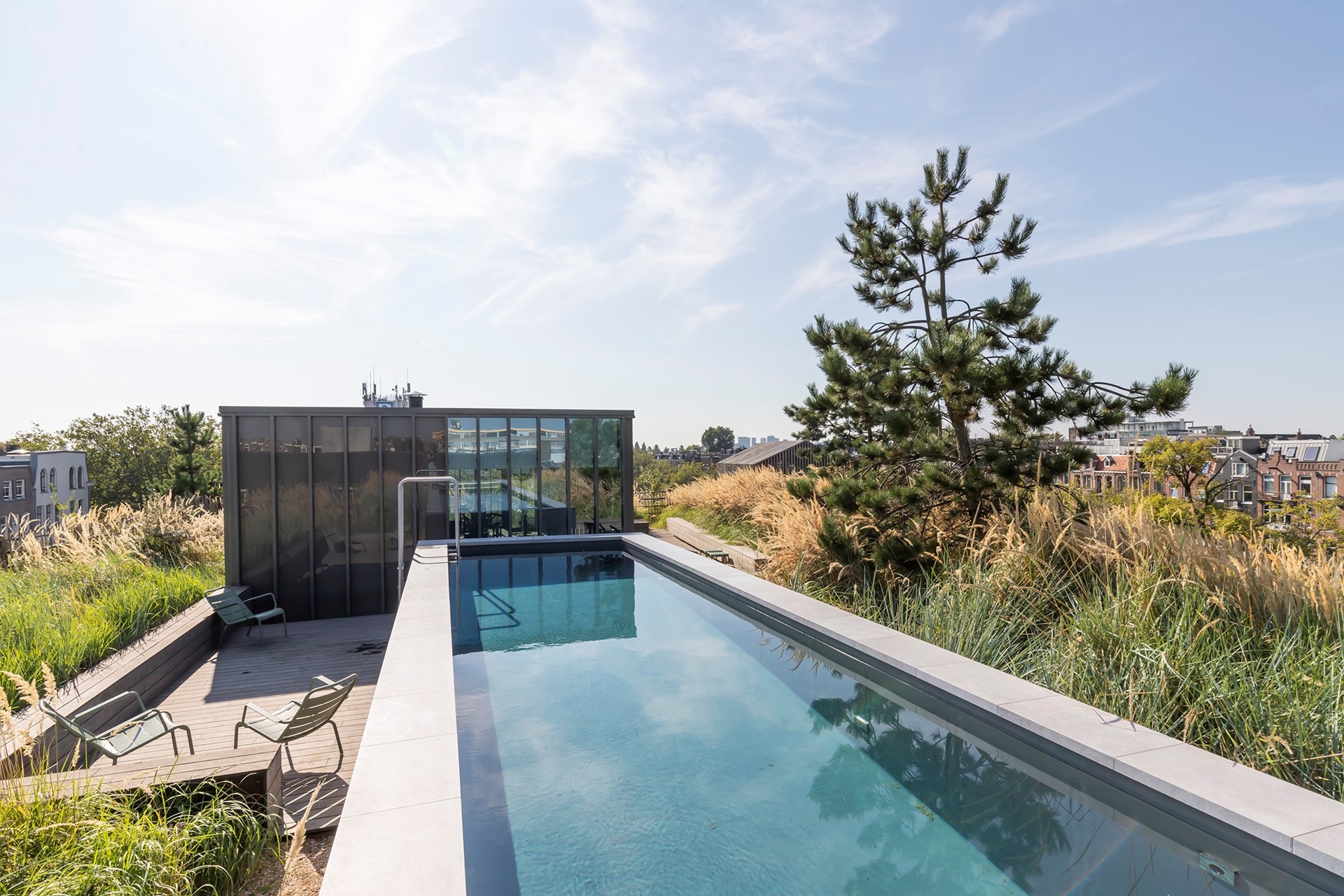 - Zwembad op het dak van de gezamenlijke daktuin met duinlandschap (exclusief voor bewoners van het Singelgrachtblok) plus Fitness Studio