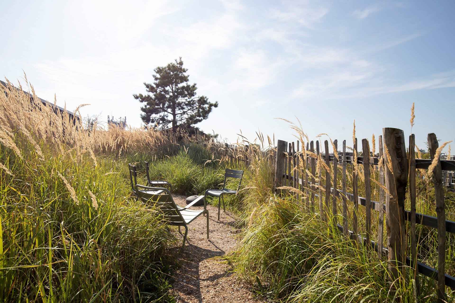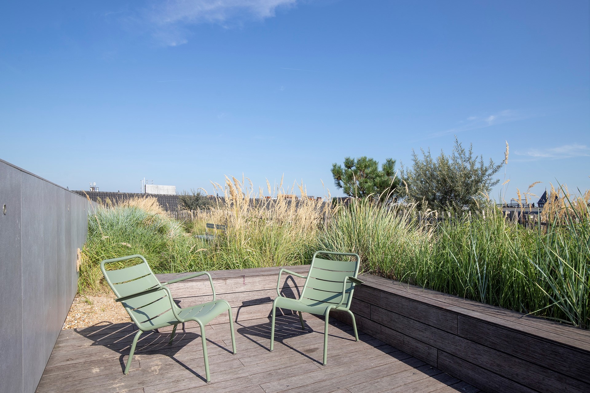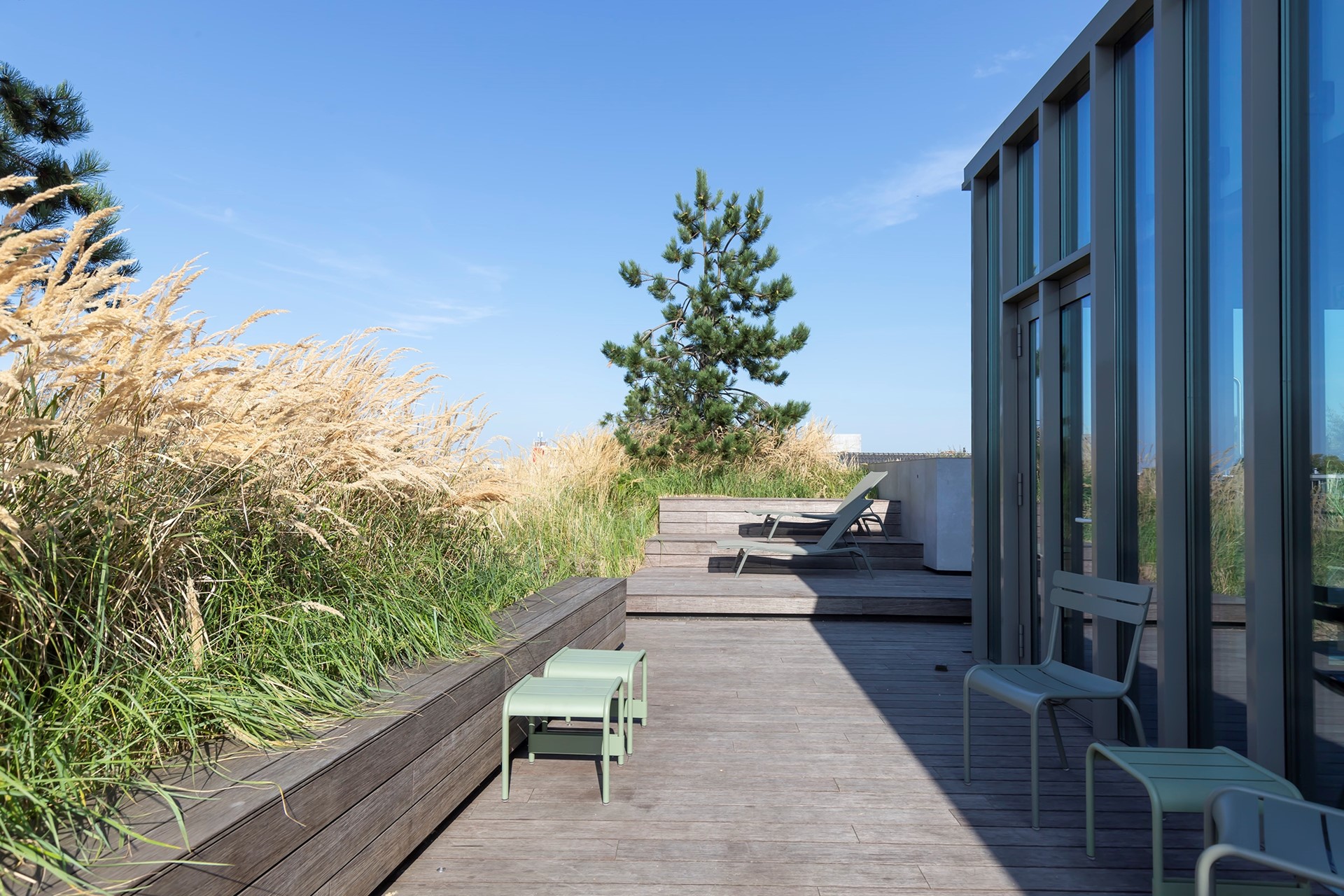 Alle appartementen zijn uniek. De buitenruimtes zijn prachtig ontworpen, zodat iedereen echt een eigen plek in de zon kan opzoeken. Op het dak is voor alle bewoners een spectaculair duinlandschap aangelegd met een buitenzwembad en een strandhuis voor feestjes, gezellige etentjes of gezamenlijke activiteiten zoals teken- of schilderworkshops. Hier zit je prinsheerlijk met je voeten in het zand, uitkijkend over de stad, te midden van helmgras en duinroos… compleet met rondzoemende bijen en overvliegende zeemeeuwen.